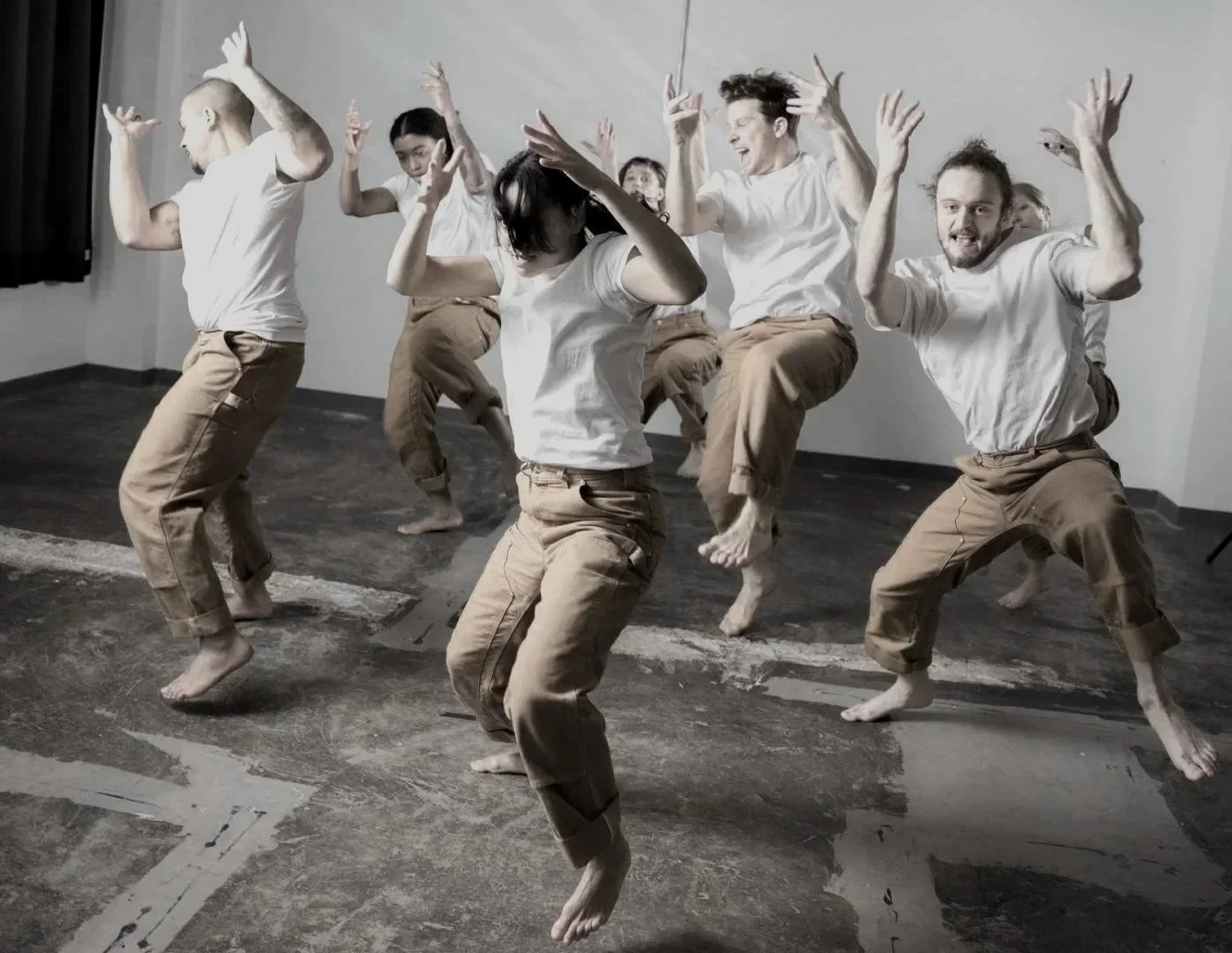 At its core, Fall(se) Circ(us) seeks to subvert expectations, transforming a traditional performance space into a shared celebration with audience members. It begins as a contemporary display of physical excellence—movement that seems to defy gravity and physics, often likened to “circus”. As the work unfolds, this intense physicality gradually dissolves to reveal a performers’ humanity — the circus falls into movement that becomes relaxed, learnable and participatory in real time. A simple hand gesture, a step, repeated throughout the show becomes an invitation for the audience to join the joyful rebellion on stage.
